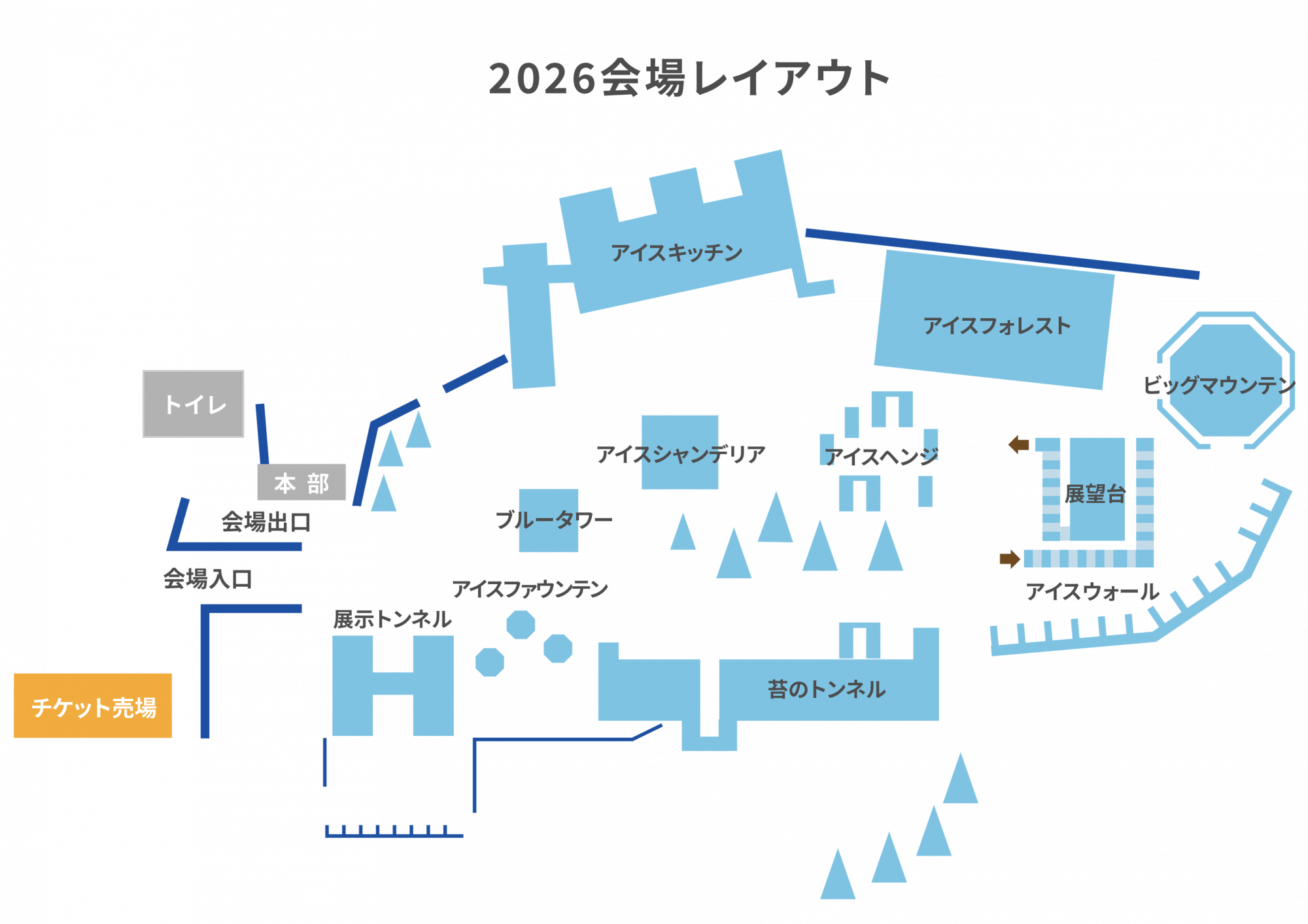会場内の氷像は、高さがなんと約13mもある「ブルータワー」や溶岩が水で侵食され回廊となった苔の洞門(※現在は閉鎖)をモチーフにした氷像、支笏湖や周辺の山々を一望できる「展望台」、温かい飲み物を楽しめ「アイスキッチン」など見どころ満載!