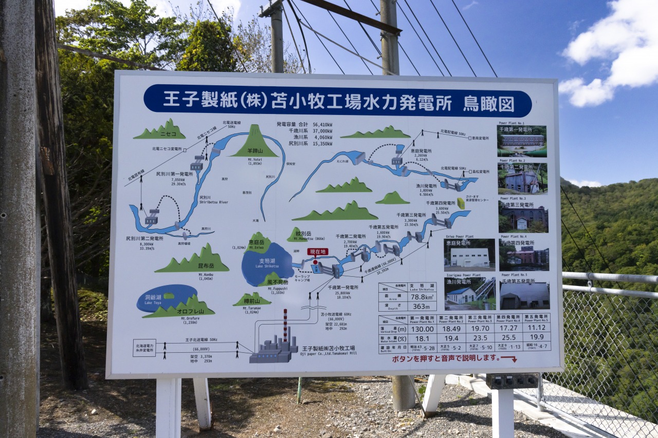 道道16号支笏湖公園線( 支笏湖スカイロード)沿いの入口から少し入ったところにある水力発電所。1910年(明治43年)に苫小牧の王子製紙苫小牧工場に電力を供給するために竣工し、百年以上の歴史を誇る。落差130mの送水管からを見下ろす景色はまさに絶景。支笏湖ドライブの寄り道にも最適。春は桜、秋は紅葉の名所としても知られています。